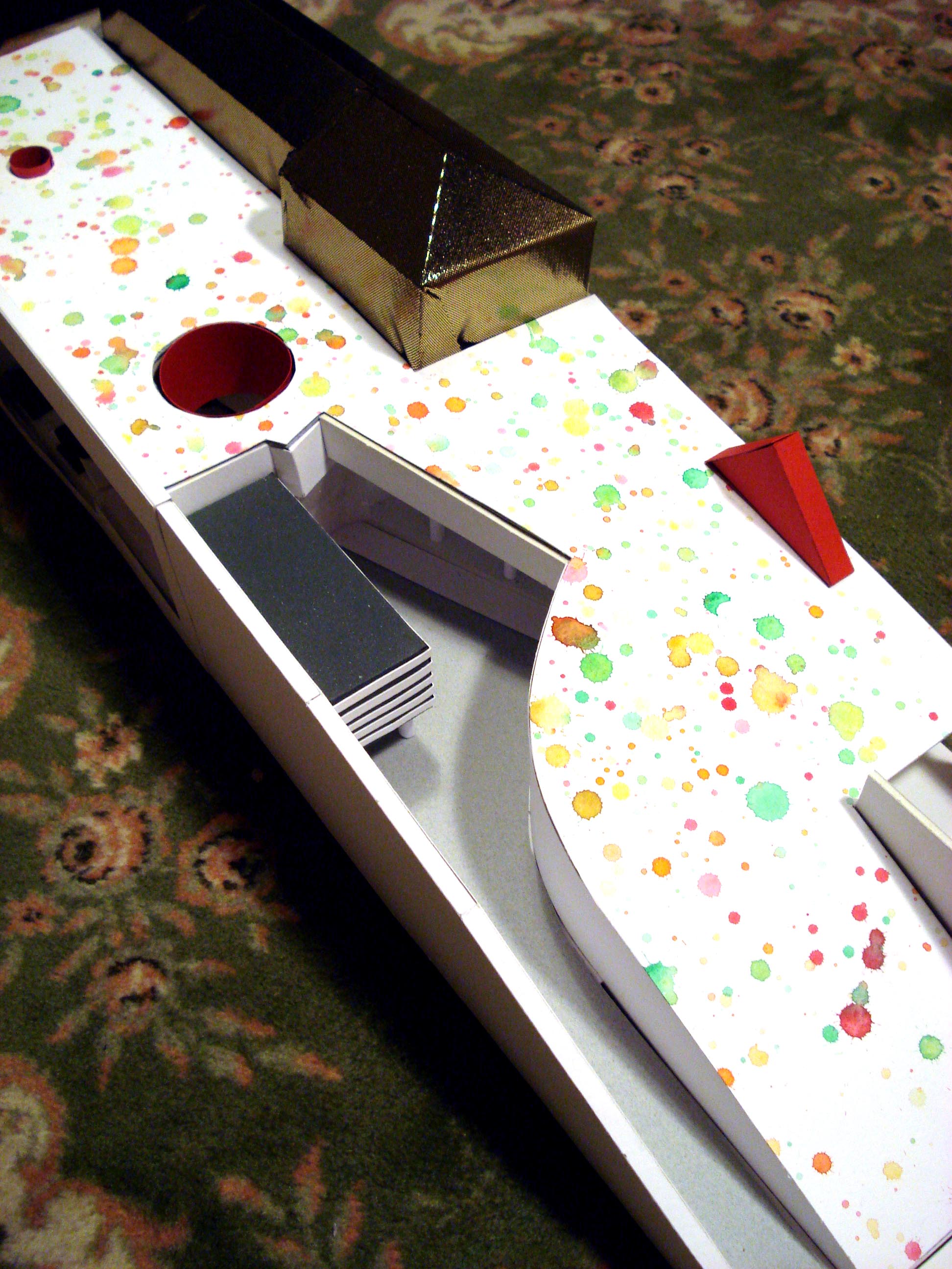 The establishment space is one large room, symbolising a universe, articulated by various mechanisms, crossed by a path. This path pierces the entire room and connects all of the instalations and spaces and continues with the accomodation rooms.