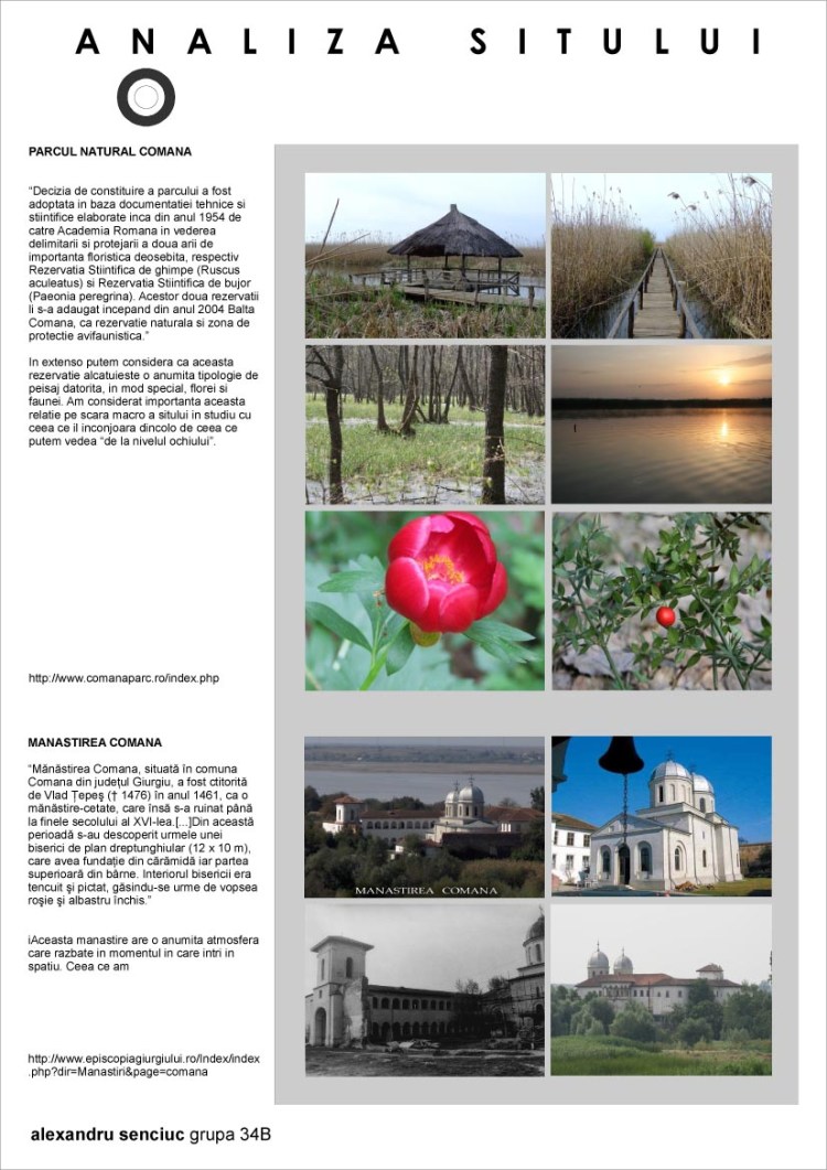 The Gellu Naum Cultural Establishment in Comana is a built ensemble of spaces raised in the spirit of surrealism, which has its roots in the complex and contradictory context. In the territory, The Gellu Naum Memorial House is one of the points of a landmark triangle, the other two being the Comana Natural Reservation, which gives the landscape its specificity, and the Comana Monastery, as historical human intervention. What is particular about this Reservation is this lacustrine enviroment of reed. Water plays an essential part here, it being the main enviroment for the vegetation and fauna. The Comana Monastery, on the other hand, is the landmark for human intervention(1461, during Vlad Tepes) but also serves as building model for the nearby houses. The special feature if this Monastery consists in the underground galleries with brick vaults which have been kept intact up to date.