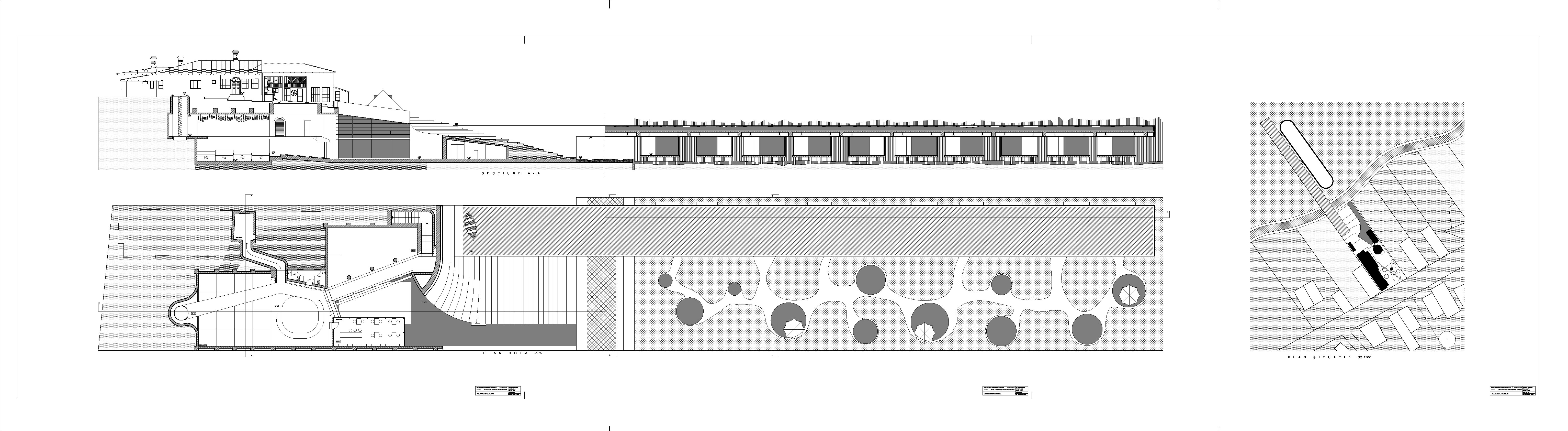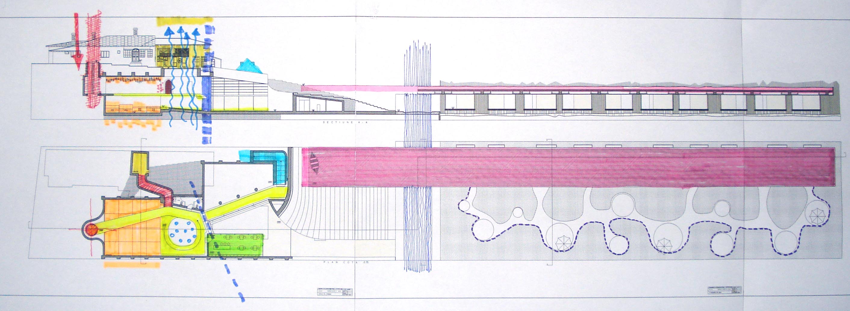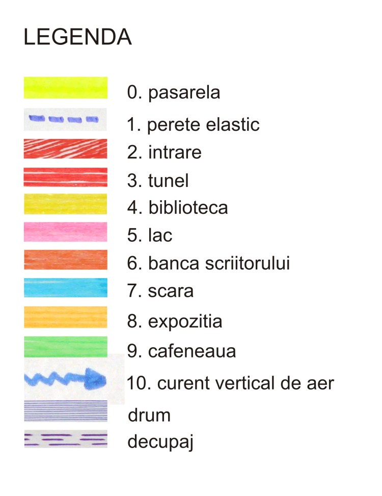 One of the first articulation is represented by the separation between public space(the expo) and the private space(the workshop) through a wall made of a double layer of elastic material that vibrates(1). The wall is fake because of the way it behaves, like an eardrum. There is dialogue between the new space of the establishment and the memorial house through an underground tunnel connecting the main space of the establishment to the cellar underneath the house(2). Moreover the cellar itself is transformed into a small library and the main space of the house(the exterior living) into a reading area(3). Gellu Naum used to go on trips on the lake with his boat, so, as an ironical gesture towards the dead writer and the dissapearing lake, the boat and the lake reappear(4). The bench on which the writer used to sit keeps the same position while everything around it shifts radically(5). It also keeps its role of meditation point because of the incision in the landscape opening it to a view of the swamp. The connection between the new lake, the house and the establishment space is emphasised by a stair climbing from the workshop to the upper land guiding the visitor’s view first towards the house and then towards the lake(6).The expo space has a grid of platforms and lighting units that shift through a computer-controlled software in the technical room(7).The coffeeshop, for the public mostly, of different nature than the establishment, positions itself violently inside the space through penetration and parazitation(8). The turning point of the path is marked through a vertical flow of air created by the skylight and heated floor underneath(9).