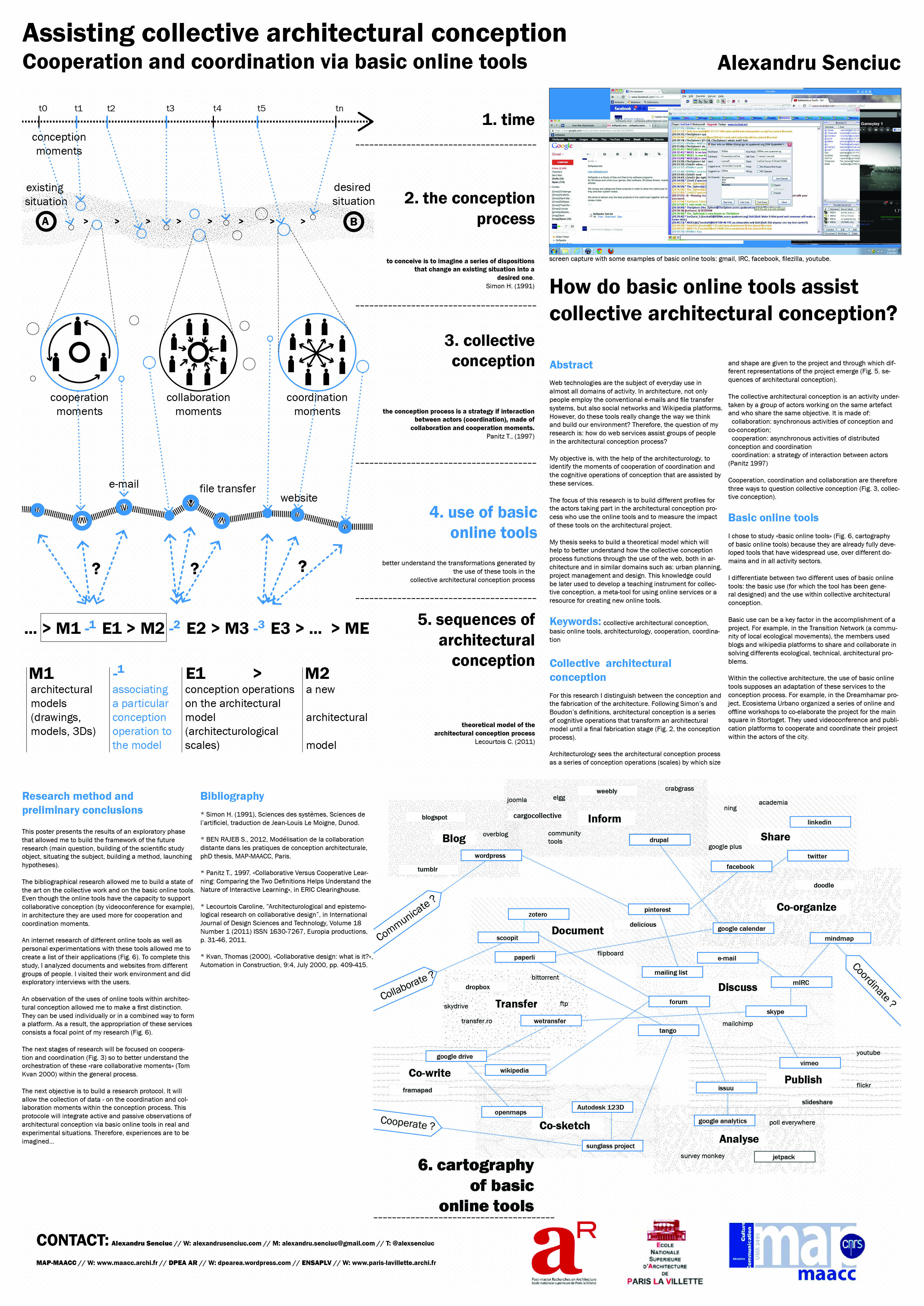 On the 17th of May I presented a research poster containing the subject of my future phD thesis in architecture: “Assisting collective architectural conception: cooperation, coordination and collaboration via basic online tools”. The event was organised by Research Department of the ENSAPLV school, within the DPEA programme.